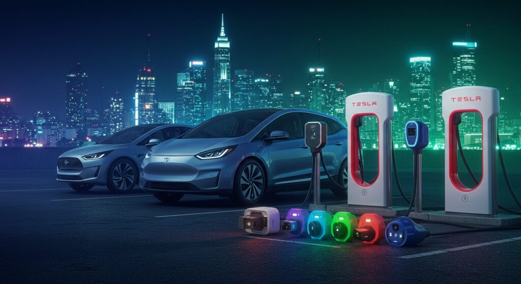 Pour comprendre l’essor des dongles, il faut d’abord examiner les différences entre les normes de recharge. Historiquement, la majorité des VE aux États-Unis utilisaient le standard CCS, qui combine deux types de connecteurs : le J1772 pour la recharge lente (niveau 2) et un connecteur spécifique pour la recharge rapide. Tesla, en revanche, a développé sa propre norme, la NACS, qui utilise une conception plus compacte et efficace, capable de gérer à la fois la recharge lente et rapide avec les mêmes broches.