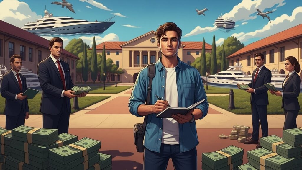 Baker décrit un système où les étudiants sont vus comme une marchandise précieuse. Les venture capitalists rivalisent d’ingéniosité pour attirer les plus prometteurs : fonds secrets, sociétés écrans, fêtes somptueuses sur des yachts, offres de financement avant même qu’une idée ne soit formulée.